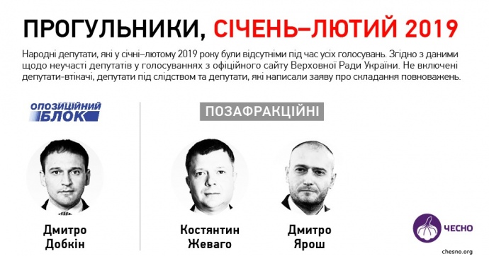 У січні та лютому 2019 року 9 нардепів не проголосували на жодному з 18 засідань Верховної Ради, під час яких відбулося 304 голосування.