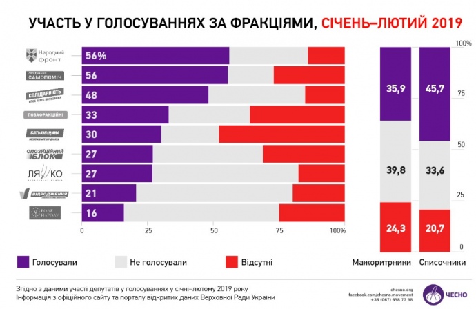 Найбільшу кількість голосувань січня-лютого 2019 року не відвідали народні обранці з фракції "Батьківщина" (47,7%), позафракційні (36,1%) і "Опозиційний блок" (31,1%).