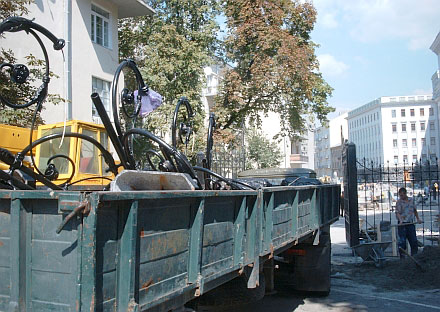 Крім встановлення нового паркану, на Банкову також завезли ліхтарі. Але, запевнили робітники, це ті ж самі, які стояли і раніше. Просто їх пофарбували і розмістять тепер в іншому порядку.