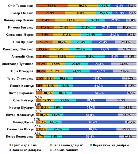 Екс-прем'єр і президент на сьогоднішній день, як і раніше, мають досить високий показник довіри з боку жителів столиці: повністю довіряють і переважно довіряють Тимошенко - понад 60% опитаних, Ющенко - майже 60%. Для цих політиків також притаманний найнижчий рівень недовіри: повністю не довіряють і переважно не довіряють їм близько 30% киян.