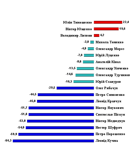 Юлія Тимошенко та Віктор Ющенко - лідери рейтингу довіри киян. Серед інших політиків - найпозитивніші показники у Володимира Литвина. В інших політичних діячів баланс довіри/недовіри має негативне значення.