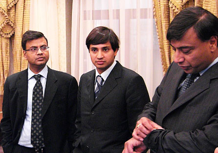 Справа наліво: Лакшмі Міттал, його син Адітья і представник на торгах Судхір Махешварі |