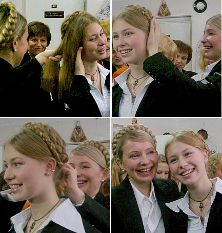 Відчувалось, що до приїзду Тимошенко школа серйозно підготувалась: екскурси у колишні класи Тимошенко, у шкільний музей народознавства тощо закінчились заплітанням кіс учениці 8-б класу 75-тої загальноосвітньої школи Дніпропетровська Діани Карташової. Зробила це Тимошенко вправно і швидко.