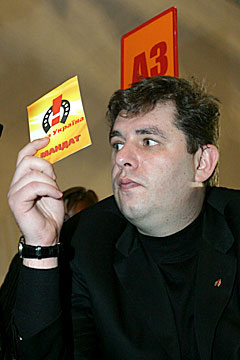 ...Яскравий за формою і пустий за змістом міжпартійний з'їзд блоку "Наша Україна" закінчився дощем із конфетті та фінальною піснею у виконанні гурту "Кому вниз". Соліст Андрій Середа за своєю статурою і лисиною нагадав одного політичного опонента нашоукраїнців. Тому по залу поповзли чутки: "Диви-диви, он Міша Бродський співає!...". Це був один із нечисельних веселих моментів на цьому зібранні.