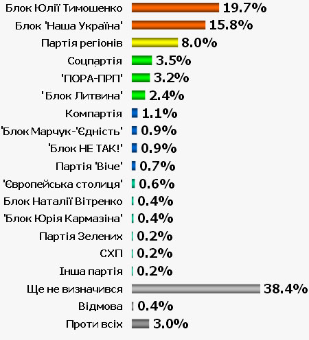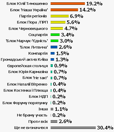 Серед тих, хто готовий прийти на вибори, найбільшою прихильністю користується Блок Юлії Тимошенко (20%). Він випереджає Блок "Наша Україна" на 4%. Умовне "третє місце" посідає Партія регіонів (8%). Долають 3% бар’єр в столиці України Соціалістична партія України (майже 4%) і "Громадянський блок ПОРА – ПРП" (3%).
