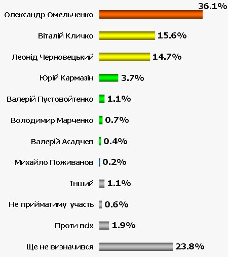 Питання: "Якщо б вибори мера м. Києва відбулися найближчої неділі, за якого з кандидатів на пост мера ви б швидше за все проголосували ?" (до тих, хто має намір прийняти участь у голосуванні)