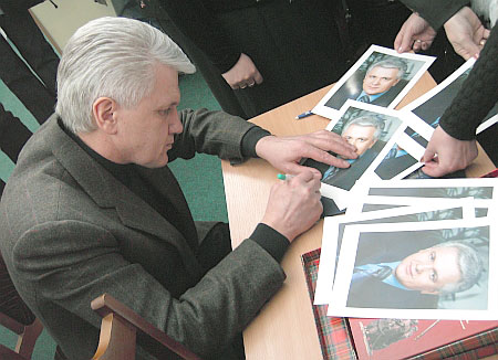 Рот не розтягується в усмішці, очі дивляться в підлогу, а там, де Ющенко або Янукович уже б обцілували і затискали жіночок-прихильниць, Литвин обмежується кивком голови.