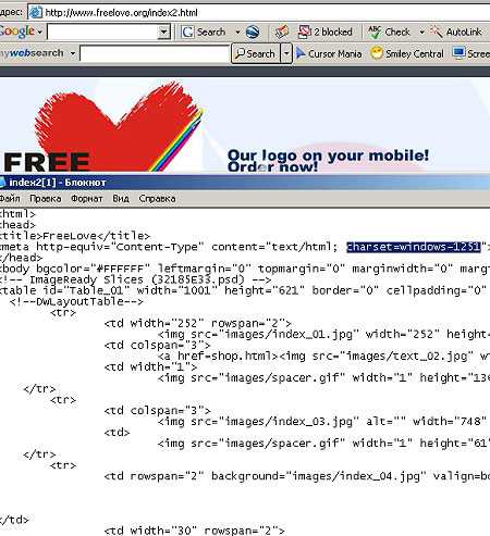 ÐÑÑге. ÐÑоглÑнÑвÑи HTML-код ÑайÑÑ http://freelove.org, можна побаÑиÑи Ñакий Ð½Ð°Ð´Ð¿Ð¸Ñ charset=windows-1251.
