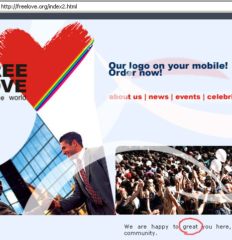 ÐамÑÑÑÑ "We are happy to great you here, on the best world website about gay community" Ð¼Ð°Ñ Ð±ÑÑи напиÑано "We are happy to greеt you here, on the best world website about gay community".
