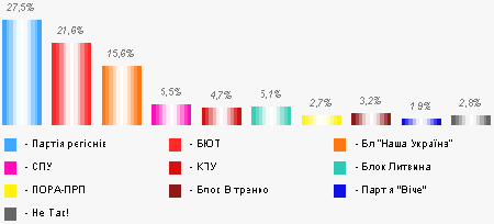 Безперечне лідерство соціологи віддають Партії регіонів, на другому місці - Блок Юлії Тимошенко, "Наша Україна" - на третьому. 4-е місце - за соціалістами. В лідерах парламентської гонки також називаються комуністи, опозиційний блок Наталії Вітренко і Народний Блок Литвина.