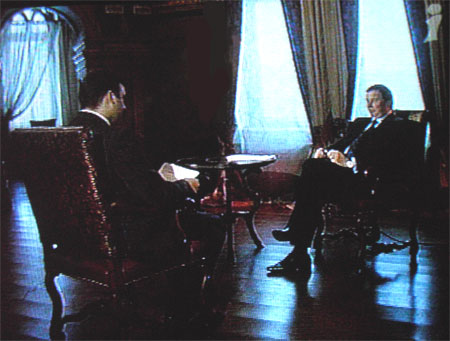 Разговор проходил в роскошной обстановке, приближенной к дворцовой. Бакай предстал перед публикой тщательно подстриженным, с блестящими от геля волосами, в темно-синем костюме и галстуке.