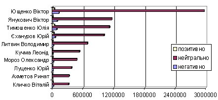 | Рейтинг тональності представленості в друкованих ЗМІ найбільш згадуваних політиків з 25 лютого по 3 березня 2006 року. Данні інформаційно-консалтингової компанії "КомІнформ". Всього компанія рейтингує 100 політиків. |