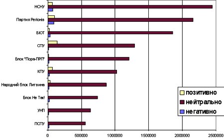 | Рейтинг тональності представленості у ЗМІ 10 найбільш медіа активних партій з 28 лютого по 3 березня 2006 року. Данні інформаційно-консалтингової компанії "КомІнформ". Всього компанія рейтингує 50 партій. |