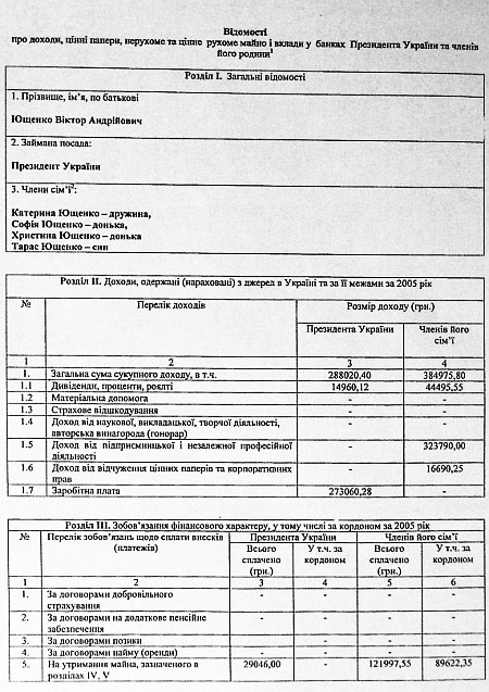 У п’ятницю секретаріат президента оприлюднив його декларація за 2005 рік.