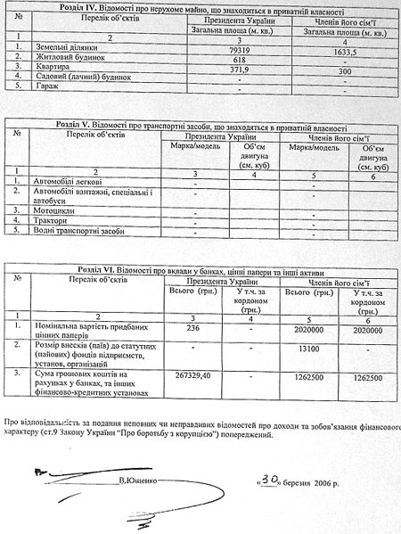 За останній рік збільшилась і нерухома власність, зокрема, земля президента. Якщо в минулому році в Ющенка було 63 тисячі 470 квадратних метрів, то в 2005 – уже 79 319 квадратних метрів.