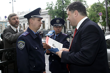 | Петро Порошенко роздає перехожим партійну пресу |