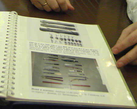 Що ж відбувалося у цьому кабінеті, я можу дослівно передати. На тому кріслі сидів Ренат Леонідович, тут сидів я. Я йому продемонстрував цей альбом вилученої зброї у бійців цього "Люкса". (Луценко підходить до шафи, звідки дістає альбом з фотографіями і показує його.) От, наприклад, це з озера піднятий пістолет, з якого був замах на сина Щербаня. Ось арсенал десятків автоматів, гранатометів.