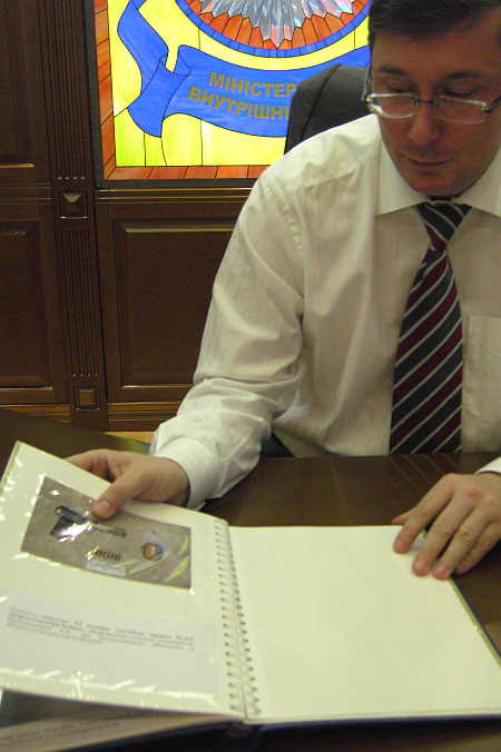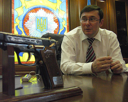 | На столі Луценка - пістолет від Ющенка з клеймом "Вірю! Знаю! Можемо!" |
