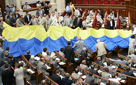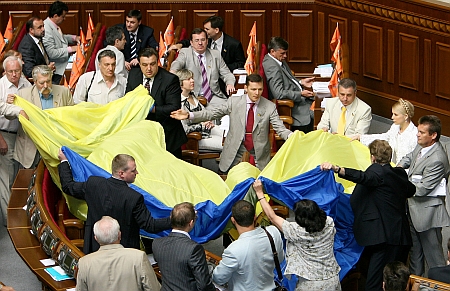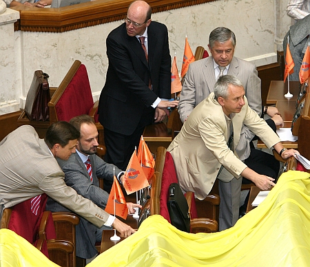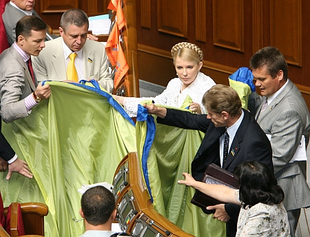 Після виступу Тимошенко представники БЮТ разом з нею розтягнули великий жовто-блакитний прапор та розклали його на місця, де мають сидіти члени БЮТ та "Нашої України".