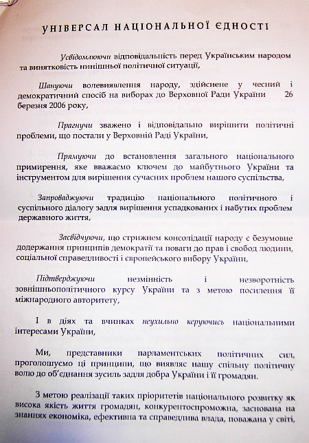 Текст проекту Універсалу національної єдності, запропонований президентом Ющенком учасникам круглого столу. Остаточна версія, яку підпишуть політичні лідери, має бути узгоджена робочою групою в п'ятницю.