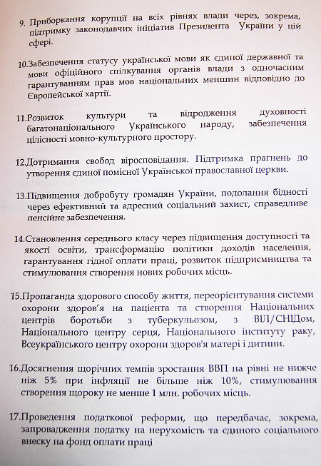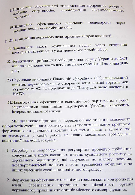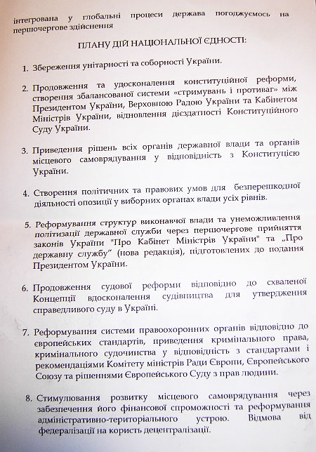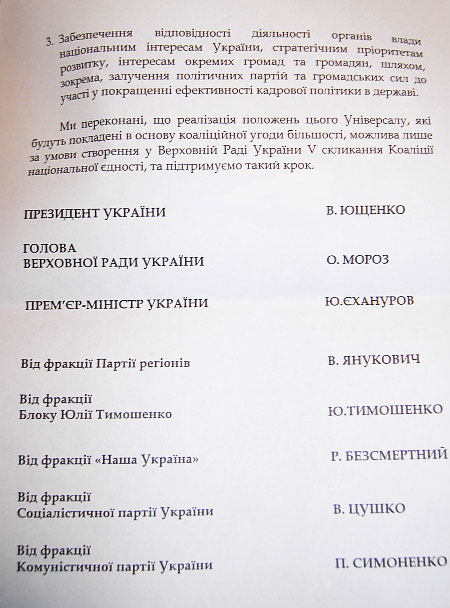 Текст проекту Універсалу національної єдності, запропонований президентом Ющенком учасникам круглого столу. Документ, через який весь день сперечалися Ющенко, Тимошенко, Мороз, Янукович, Симоненко та інші переговорники.