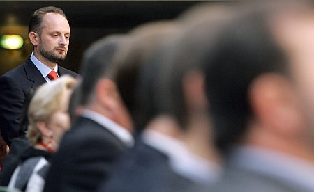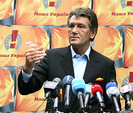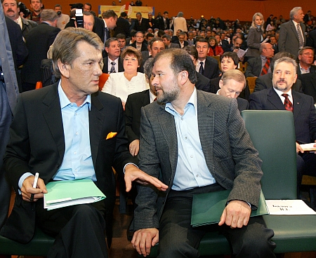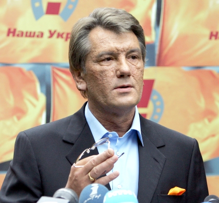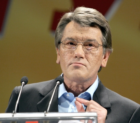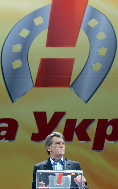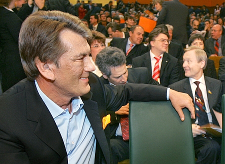 Президент Віктор Ющенко, одягнутий у чорний піджак із помаранчевою хустинкою, під час виступу не був надто добрим до власного дітища.