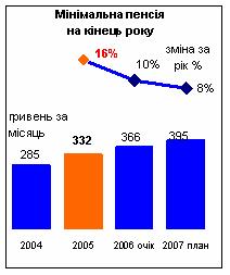 Мінімальна пенсія зросте лише на 29 гривень (проти 47 гривень у 2005 році) і навіть не дотягне 400 гривень. Очевидно, що, на відміну від газових проблем промисловості, проблеми пенсіонерів уряду абсолютно байдужі. Пропаганда сурмить, що пенсія стане більшою. А на скільки, і чи стане від цього краще – мовчить.