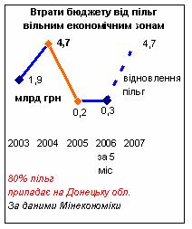 Залучення іноземних інвестицій – тільки привід для отримання пільг. Дані свідчать, що в зонах Донецької області на одну гривню втрат доходів бюджету внаслідок пільг залучено лише 22 копійки іноземних інвестицій. Це у 6 (шість!) разів гірше ніж в решті областей.