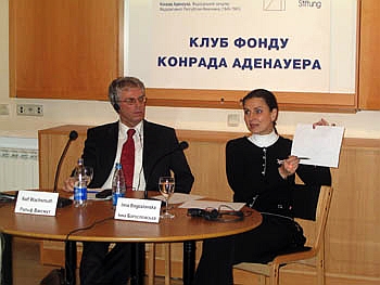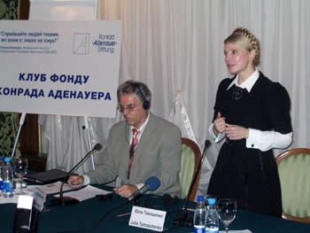 | Юлія Тимошенко та Ральф Ваксмут під час засідання клубу Фонду Конрада Аденауера. Фото з сайту Фонду |