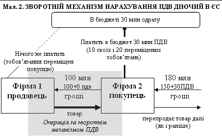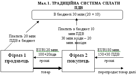 За традиційною системою (мал.1) покупець заплатить постачальнику EUR120 млн. (EUR 100 млн. + EUR20 млн. ПДВ). При цьому у продавця (у фірми 1) виникне зобов’язання по вхідному ПДВ на EUR20 млн., а у покупця (у фірми 2) виникне право на компенсацію вихідного ПДВ теж на EUR20 млн. Після того як фірма 2 здійснить подальшу реалізацію товару на EUR180 млн (EUR150 млн + EUR30 млн. ПДВ) вона заплатить до бюджету EUR10 млн. (EUR30 млн. вихідного ПДВ мінус EUR20 млн вхідного ПДВ).