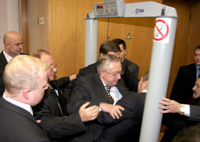 Рамку біля посту охорони, яку обов’язково потрібно пройти, щоб потрапити до зали засідань, зайняв депутат-регіонал Лук'янов. Почалась штовханина, в результаті якої металошукач висотою в людський зріст опинився на підлозі.