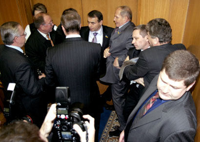 | Лук'янов не пускає Тарасюка. Фото з сайту "Нашої України" |