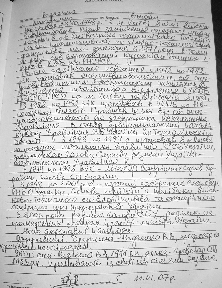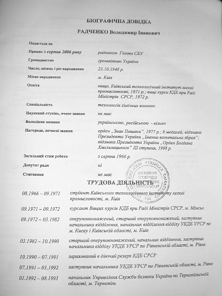 У п’ятницю в Кабміні Януковича стало на одного віце-прем'єра більше. Ним став кадровий сбушник Володимир Радченко. Традиційно перед голосуванням депутатам була роздана "оперативка" на нового урядовця. Це рідкісний випадок, коли стороннє око може ознайомитися з біографією спецслужбіста.