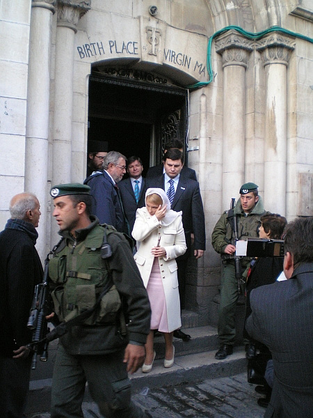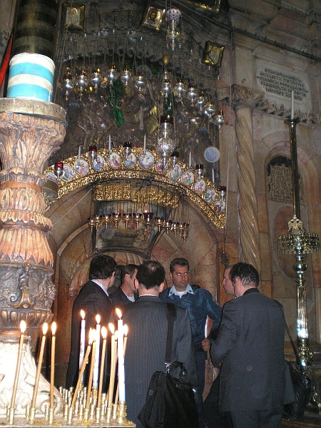 Під хрестом ізраїльські фотографи ледь не чубляться, щоб сфотографувати лідерку БЮТ на колінах. Чергу до гробу господнього зупиняють, щоб туди пройшла Тимошенко.