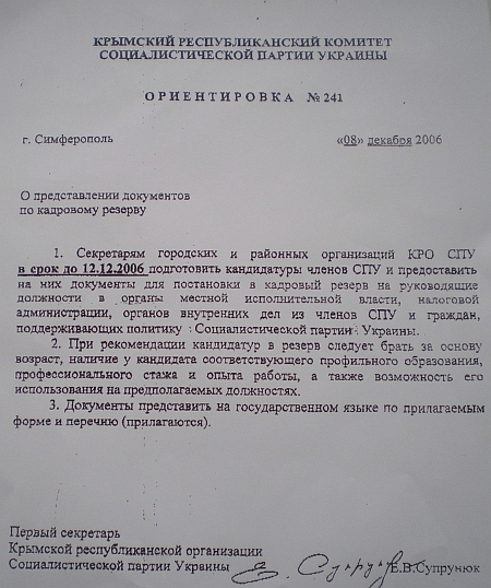 Зараз, судячи з документа, який опинився у розпорядженні "Української правди", кримські соціалісти щосили взялися за формування кадрового резерву для місцевих органів влади, міліції та податкової.