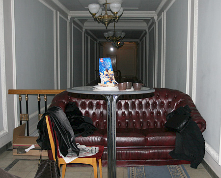 Всередині невеликого фойє депутати розбили привал – стягнули всі меблі, які були, встановили телевізор.