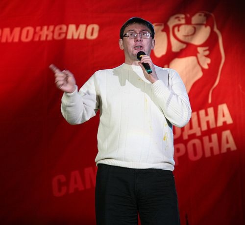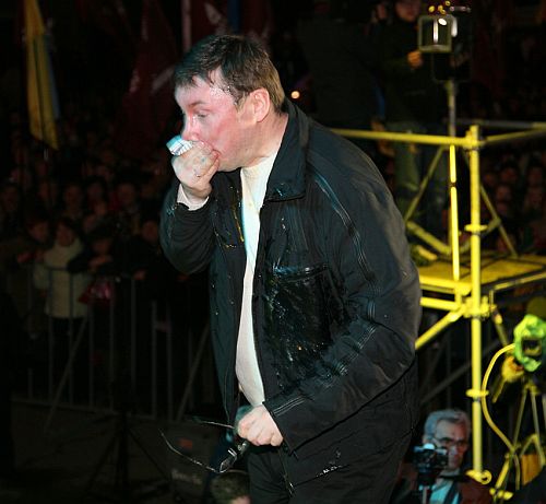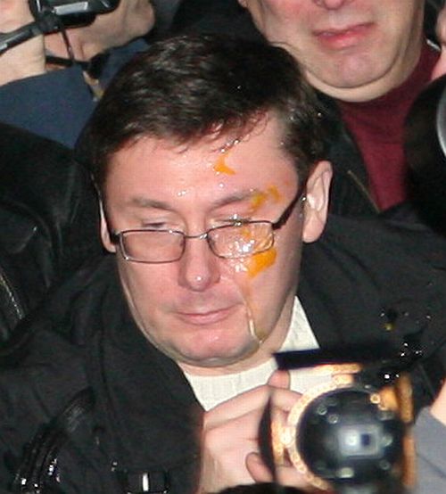 Як повідомляє газета "Україна молода", перед виходом на подіум у Луценка пожбурили яйце (судячи з усього, майже впритул). "Тупий важкий предмет" влучив у ліву скроню, заляпав окуляри, стік по щоці на куртку. Луценко на деякий час "застопорився", але досить швидко прийшов у норму, скинув куртку і виступив зі сцени у звичному стилі.