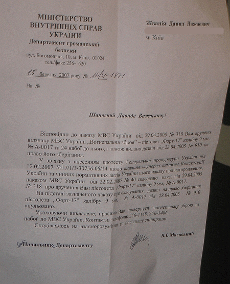 | Інформація про нагородження Жванії іменною зброєю |