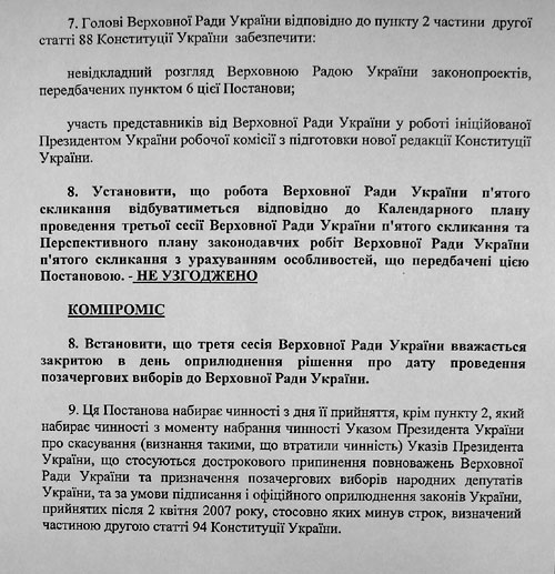 Крім того, під кінець дня стало відомо, що опозиція виступає категорично проти пункту номер дев’ять. Там міститься пряма вимога до Віктора Ющенка скасувати його укази про роспуск парламенту.
