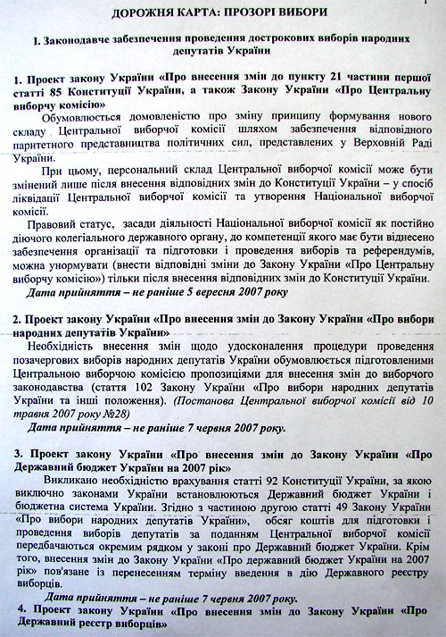 "З огляду на зазначене, лише не раніше 6 вересня 2007 року можуть бути створені правові підстави для ухвалення рішення про встановлення дати проведення позачергових виборів народних депутатів України в період 60 наступних днів", - міститься у резюме "дорожньої карти".