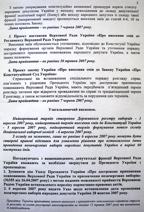 Третя частина дорожньої карти – створення умов, які б не дозволяли Ющенку та його наступникам на власний розсуд розпускати парламент. Для цього пропонується внести зміни до Конституції, де встановити "виключний перелік підстав" для оголошення дострокових виборів.