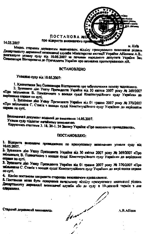 Також "Українська правда" отримала постанову про відкриття виконавчого провадження, на підставі якого Станік та Пшеничний домагаються того, щоб знову брати участь у засіданнях Конституційного суду.