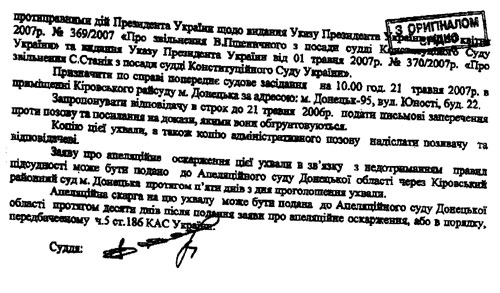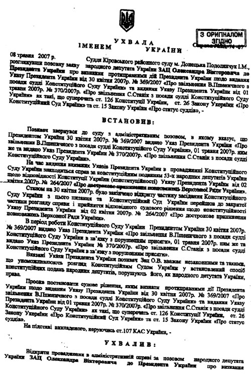 І от восьмого травня, тобто вже після домовленостей перших осіб держави, суддя Подолянчук виносить ухвалу про відкриття провадження за позовом Заца. (Текст цього документу потрапив у розпорядження "Української правди".)