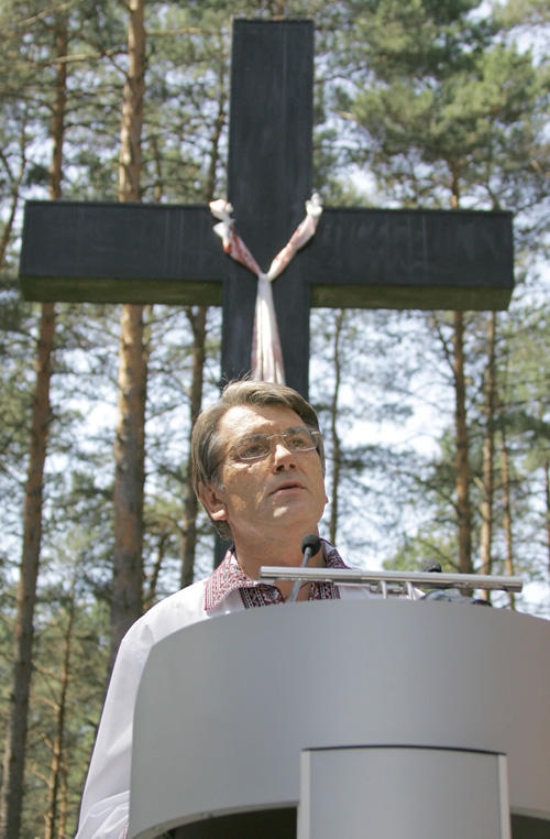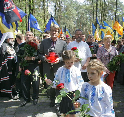 Ющенко поклав квіти до Меморіального каменя та вінок до пам’ятника-стели на території заповідника та взяв участь у панахиді за загиблими за участю духовенства українських церков.