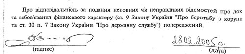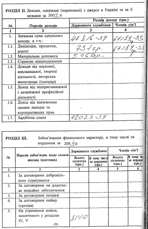 Подання на Кузьмука містило його декларацію про доходи. Щоправда, не другої, а навіть третьої свіжості – за 2004 рік, коли він працював депутатом, протягом чотирьох місяців суміщаючи цю роботу з перебуванням на посаді міністра оборони України.