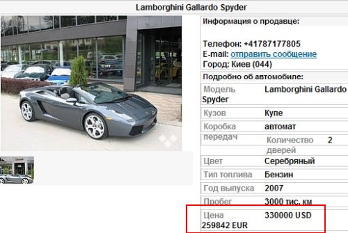 Зокрема, на одному з українських сайтів, що спеціалізується на продажу автомобілів, пропонують придбати Lamborghini Gallardo Spyder. Для контакту вказаний номер телефона у Швейцарії.