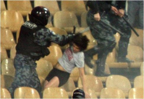 Більшість вболівальників втекли від сутички вгору по трибунах. "Махалися" з міліцією тільки бритоголові хлопці. У цей час Наталка Гнітецька перетинала сектор № 11 по діагоналі. "Беркут" її вдарив гумовою палицею. Вдарив, вочевидь, не по голові, але таке застосування сили не мало жодної підстави.