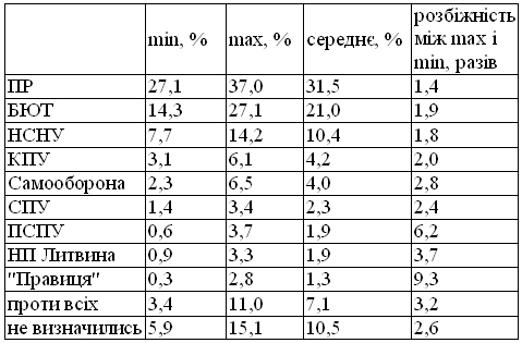Основою для проведеного аналізу послужили результати соціологічних досліджень, які впродовж квітня – червня масово з’являлись на шпальтах рейтингових газет та Інтернет-видань і результати яких є основою для формування громадської думки про впливовість тієї або іншої політичної сили.