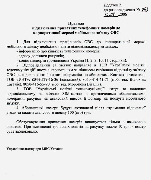Новіков вимагав, щоб всі підрозділи Міністерства внутрішніх справ перейшли на тарифні плани "Українських новітніх телекомунікацій". Крім того, пропонувалося у чергових частинах міліції (!) запровадити замість стаціонарних телефонів GSM-шлюзи, які б знову ж таки замикалися на фірму-посередника.