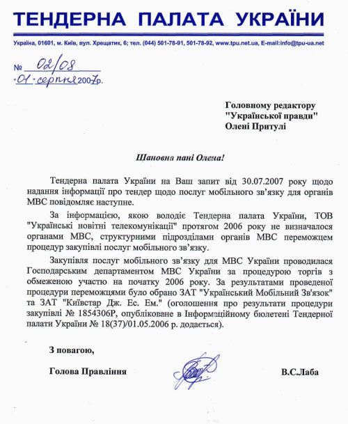 Перше. Тендерна палата підтвердила, що фірма "Українські новітні телекомунікації" була без тендеру запропонована як ексклюзивний постачальник мобільного зв’язку для міліції.
